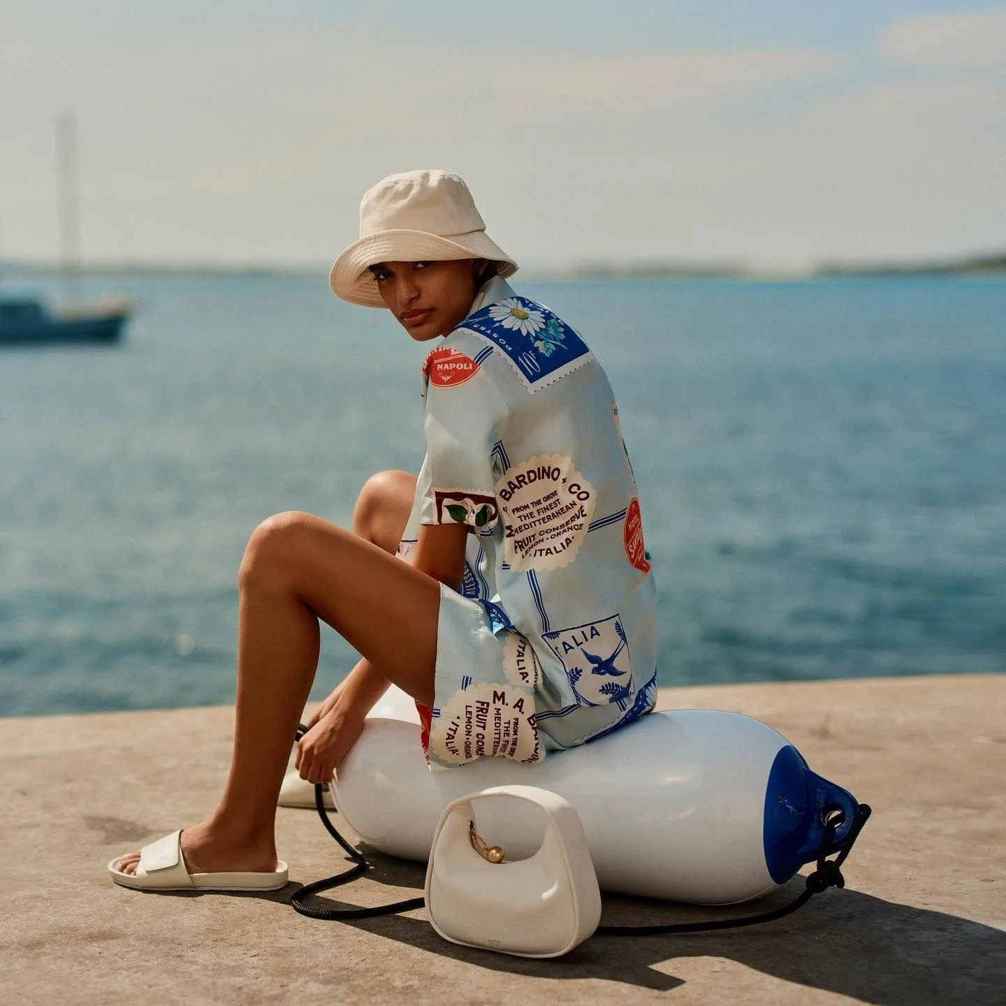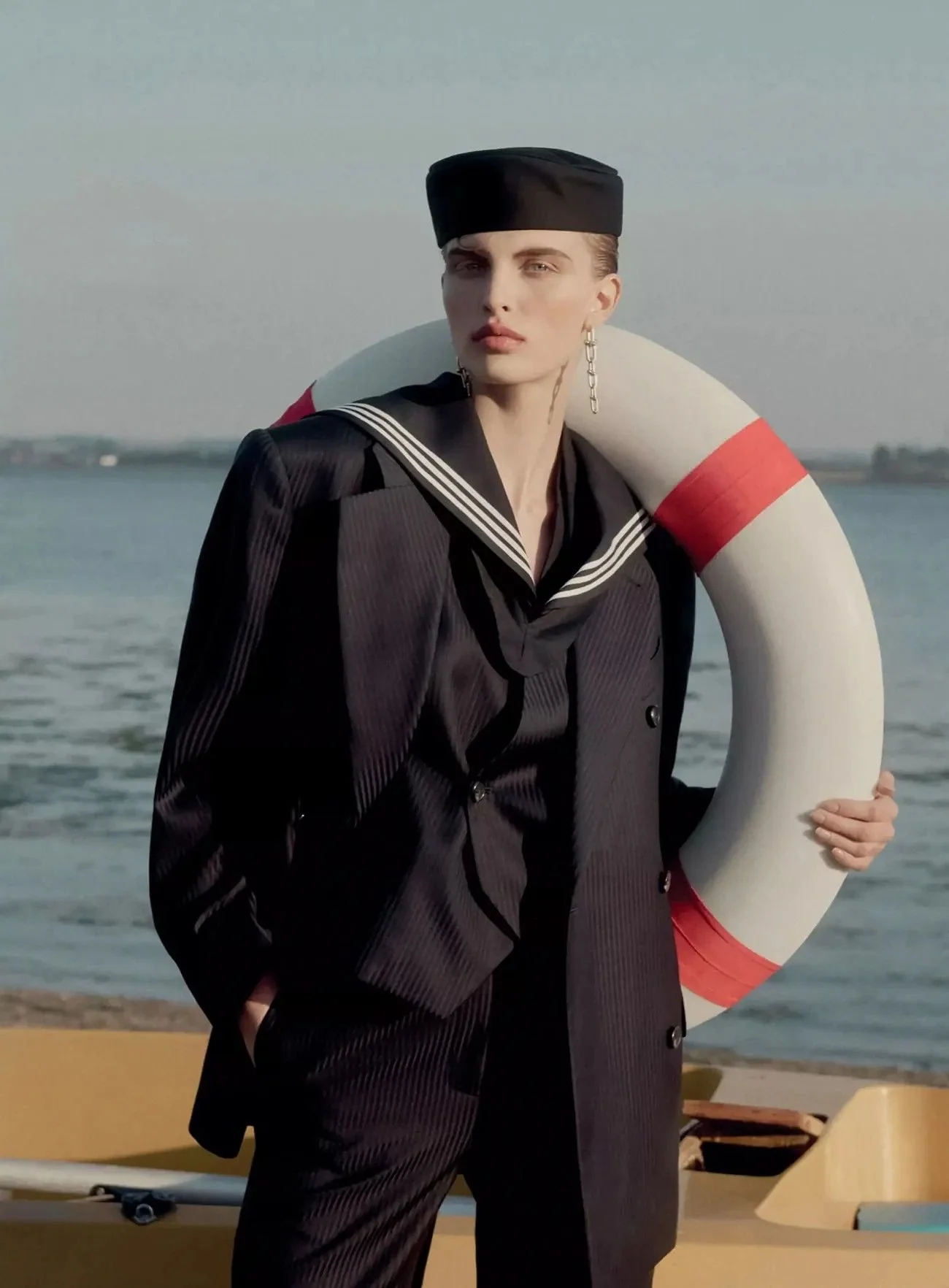 HAVE YOUR SUBJECT INTERACT OR POSE WITH THE BOATING PROP OF CHOICE , HERE THE MODEL SITS ON A BOUY