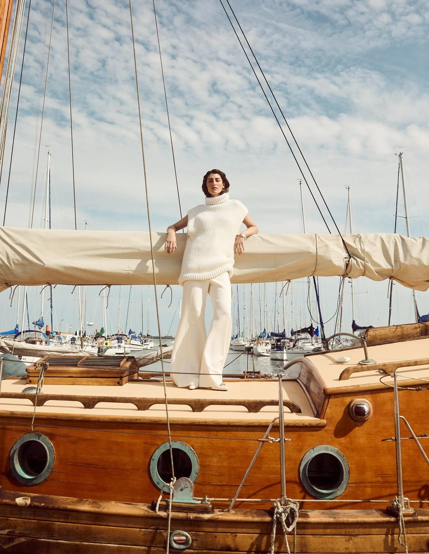HAVE HER LEAN ON THE MAST OR THE MAIN SAIL INTERACTING WITH THE SETTING
