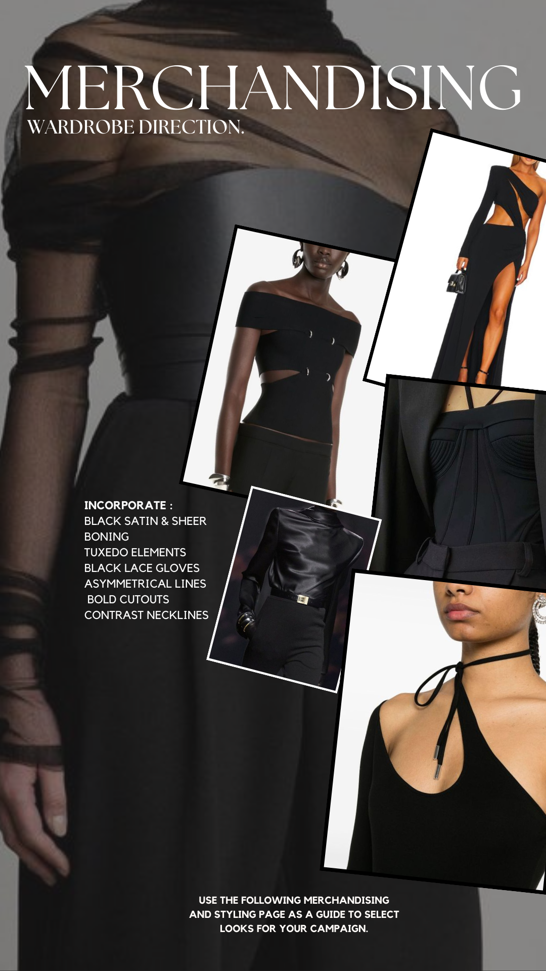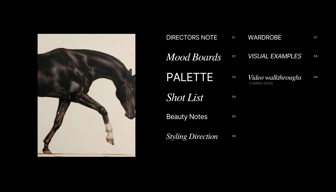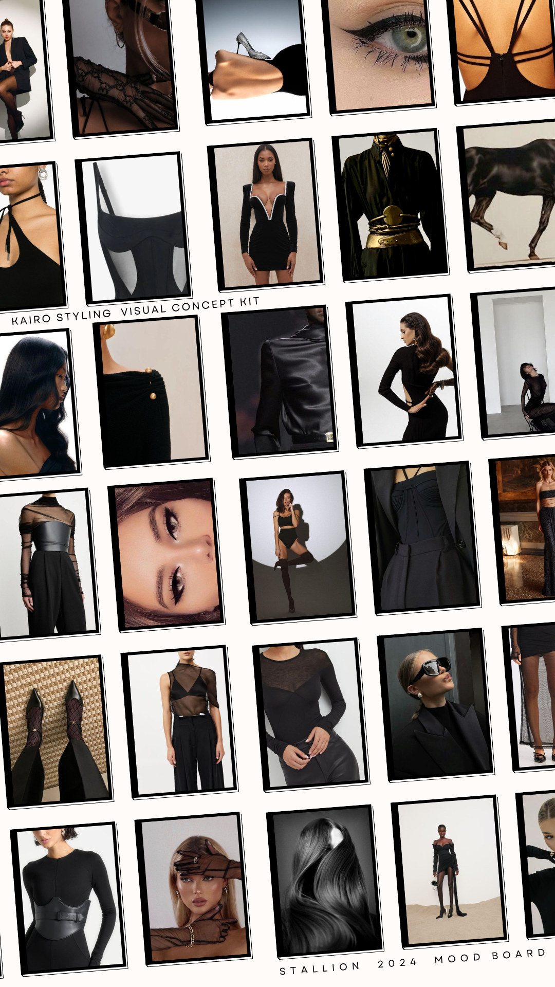 STALLION MOOD BOARD COLOR PALETTE SHOT LIST Beauty notes: go for a sHARP HIGH CONTRAST LOOK. BOLD EYES AND FULL HAIR. THIS ISN’T THE CAMPAIGN TO HOLD BACK WITH.. GO FOR DRAMA. BEAUTY